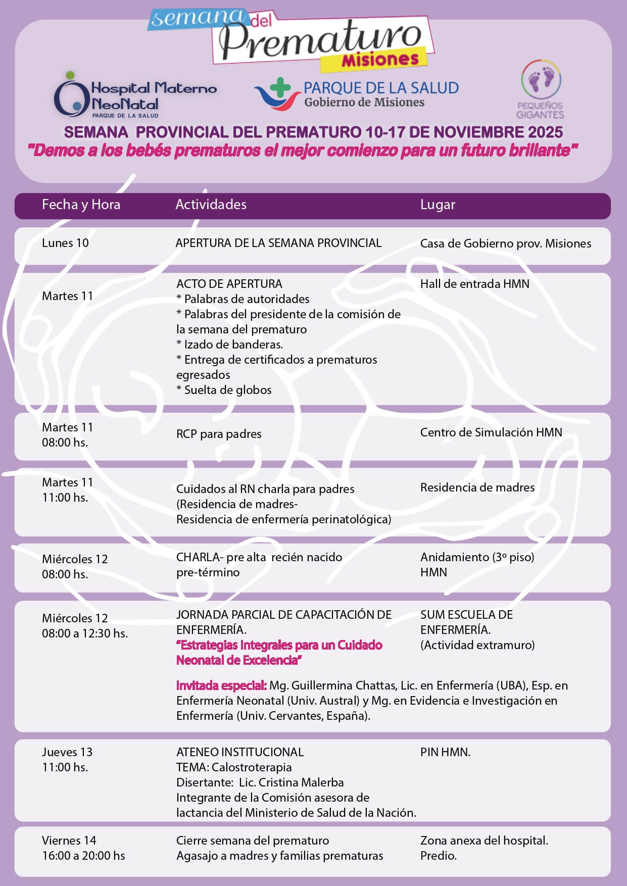 - 4ª Jornada de Enfermería Neonatal, con la participación de la Mgter. Guillermina Chattas y profesionales de la región, bajo el lema “Estrategias integrales para un cuidado neonatal de excelencia” (miércoles 12, Escuela de Enfermería UNaM).
